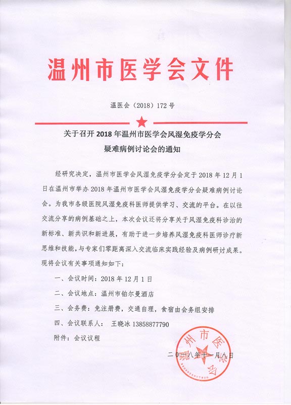 关于召开2018年温州市医学会风湿免疫学分会疑难病例讨论会的通知