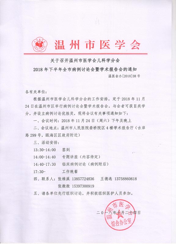 关于召开温州市医学会儿科学分会2018年下半年全市病例讨论会暨学术报告会的通知