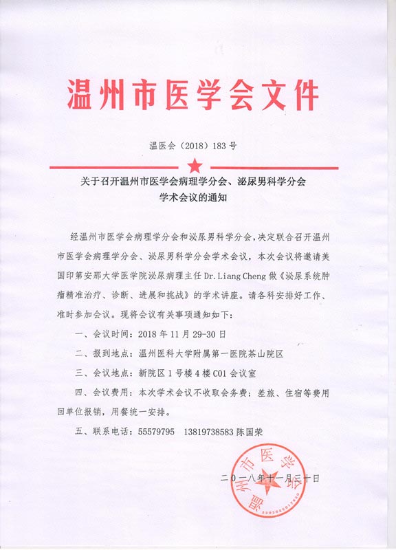 关于召开温州市医学会病理学分会、泌尿男科学分会学术会议的通知