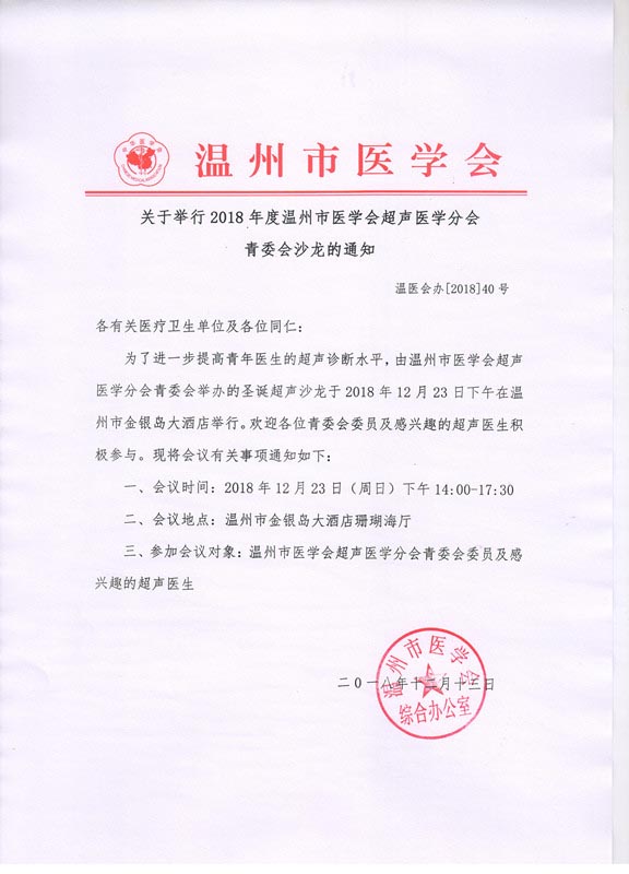 关于举行2018年度温州市医学会超声医学分会青委会沙龙的通知
