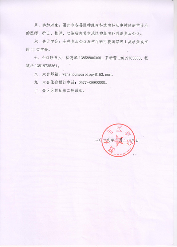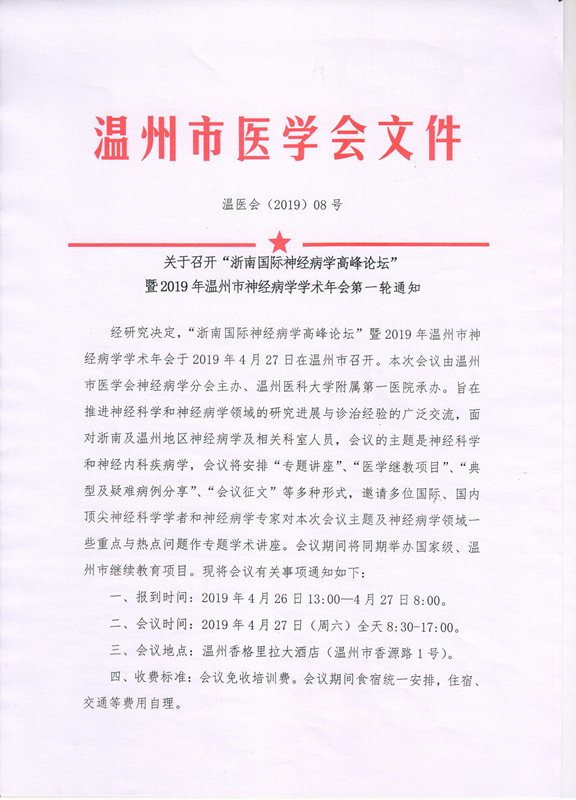 关于召开“浙南国际神经病学高峰论坛”暨2019年温州市神经病学学术年会第一轮通知