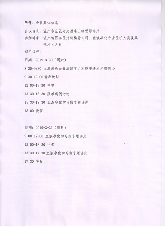 关于召开2019年度温州市肾科青年论坛暨温州市肾脏病学分会第一次疑难病例讨论会、血液透析血管通路学组和腹膜透析学组第一季度例会及第三届温州市中心医院血液净化学习班的通知