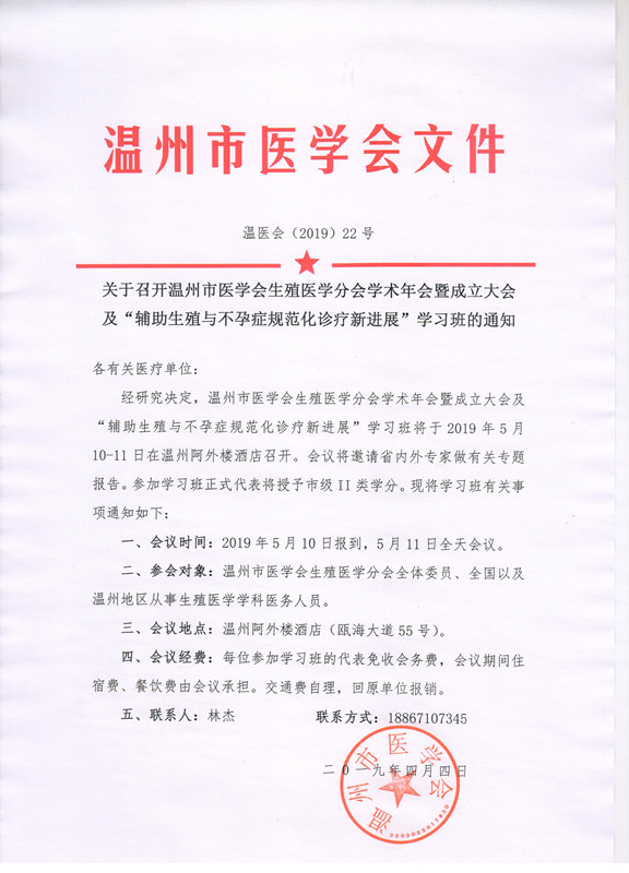 关于召开温州市医学会生殖医学分会学术年会暨成立大会及“辅助生殖与不孕症规范化诊疗新进展”学习班的通知