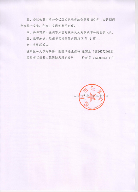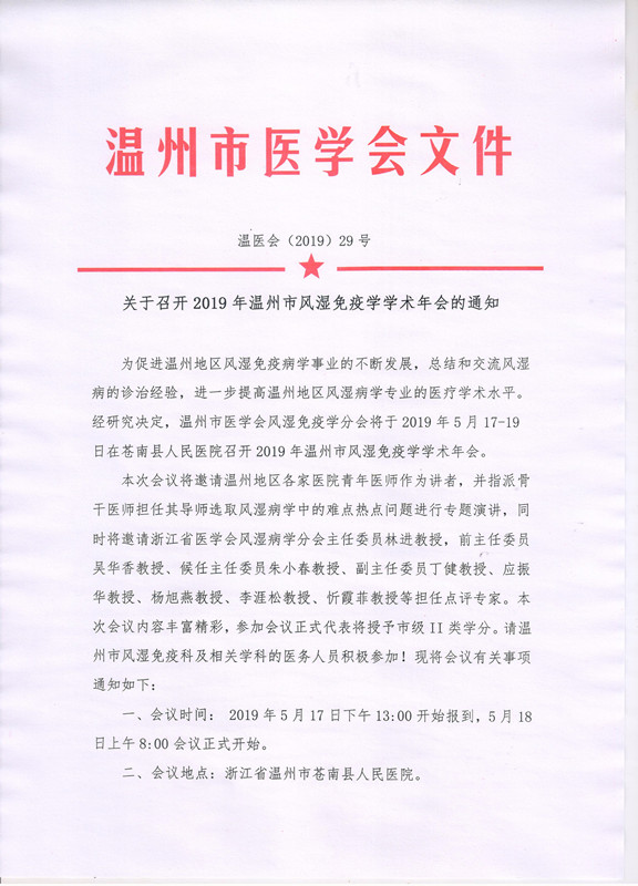 关于召开2019年温州市风湿免疫学学术年会的通知