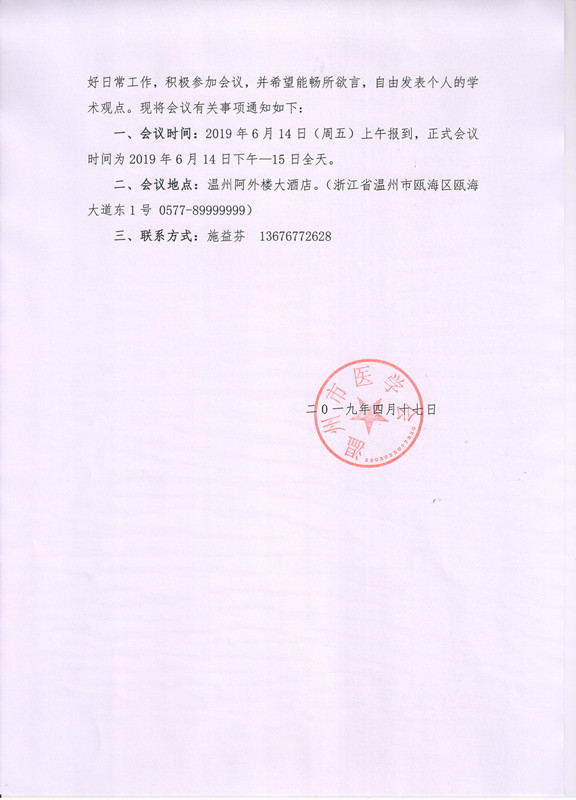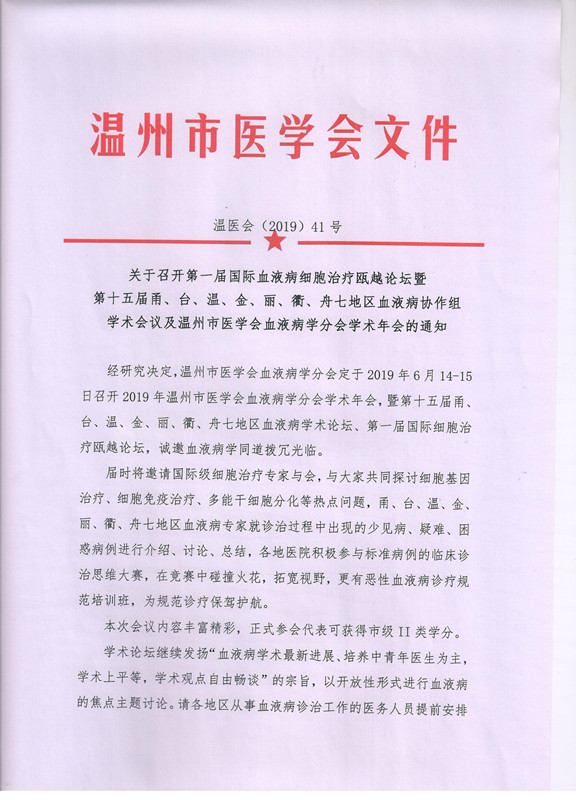 关于召开第一届国际血液病细胞治疗瓯越论坛暨第十五届甬、台、温、金、丽、衢、舟七地区血液病协作组学术会议及温州市医学会血液病学分会学术年会的通知