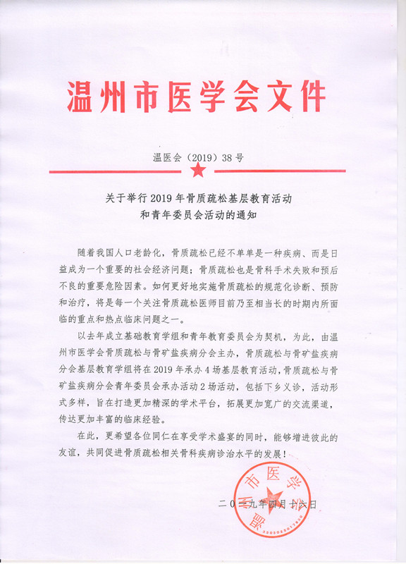 关于举行2019年骨质疏松基层教育活动和青年委员会活动的通知