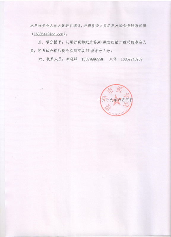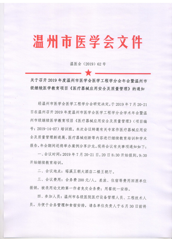 关于召开2019年度温州市医学会医学工程学分会年会暨温州市级继续医学教育项目《医疗器械应用安全及质量管理》的通知