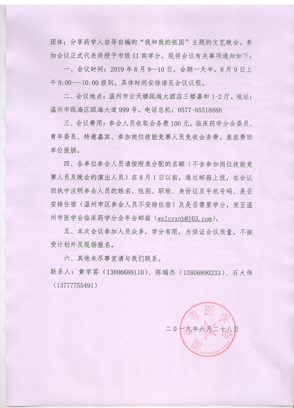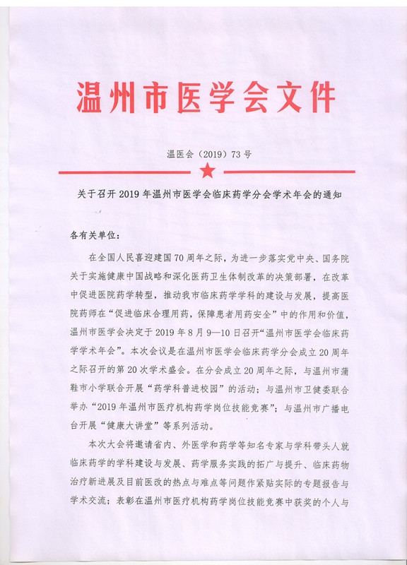 关于召开2019年温州市医学会临床药学分会学术年会的通知