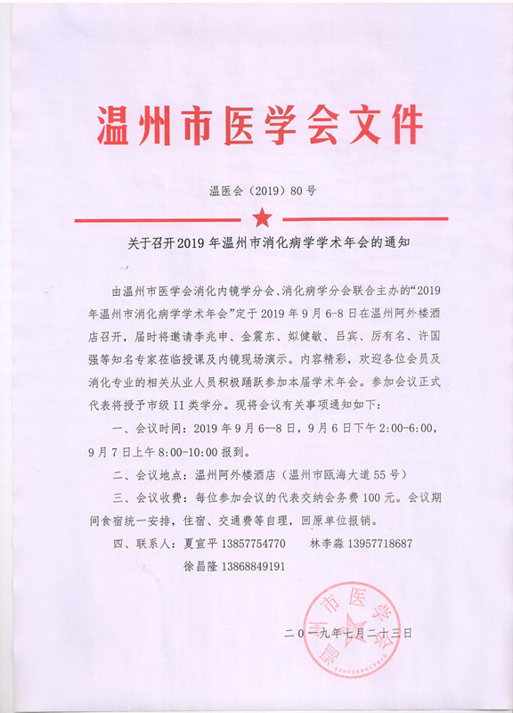 关于召开2019年温州市消化病学学术年会的通知