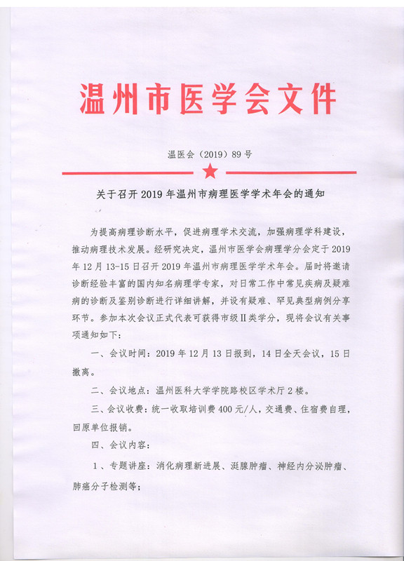 关于召开2019年温州市病理医学学术年会的通知