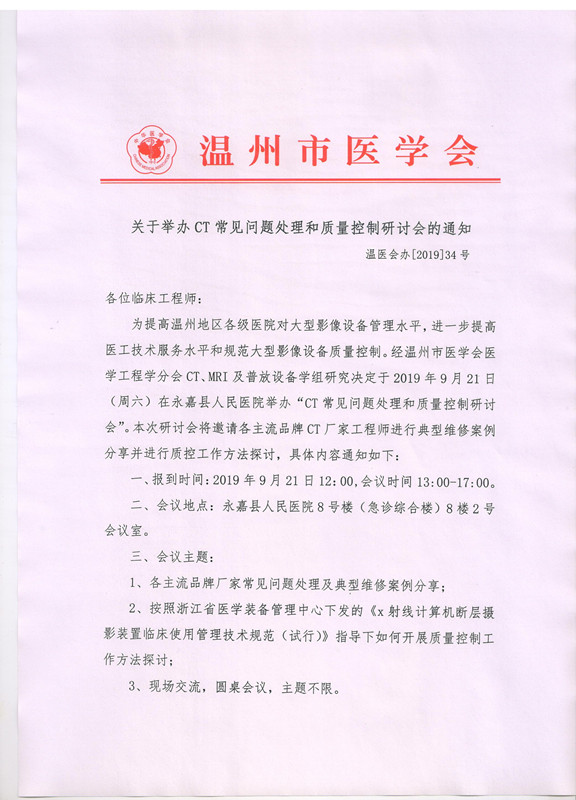 关于举办CT常见问题处理和质量控制研讨会的通知