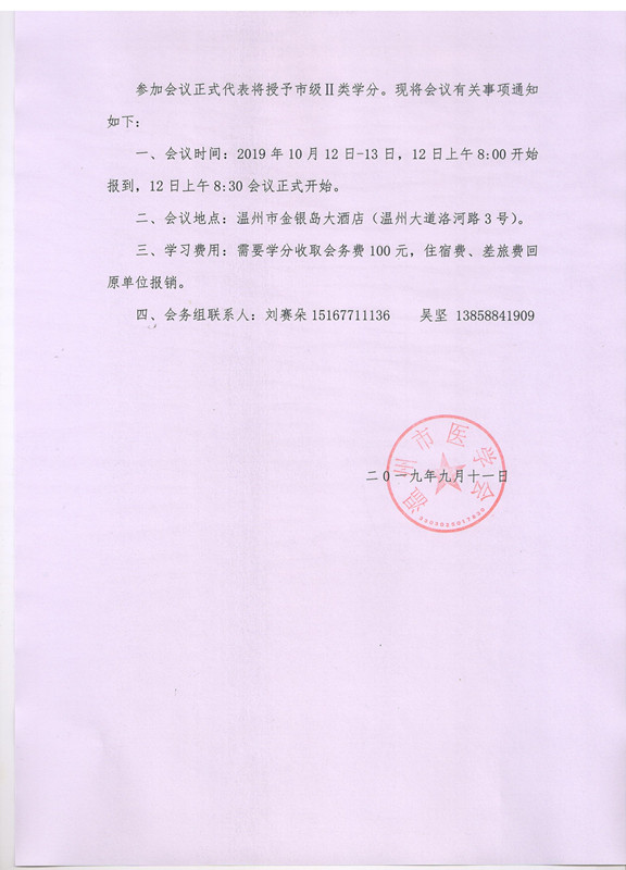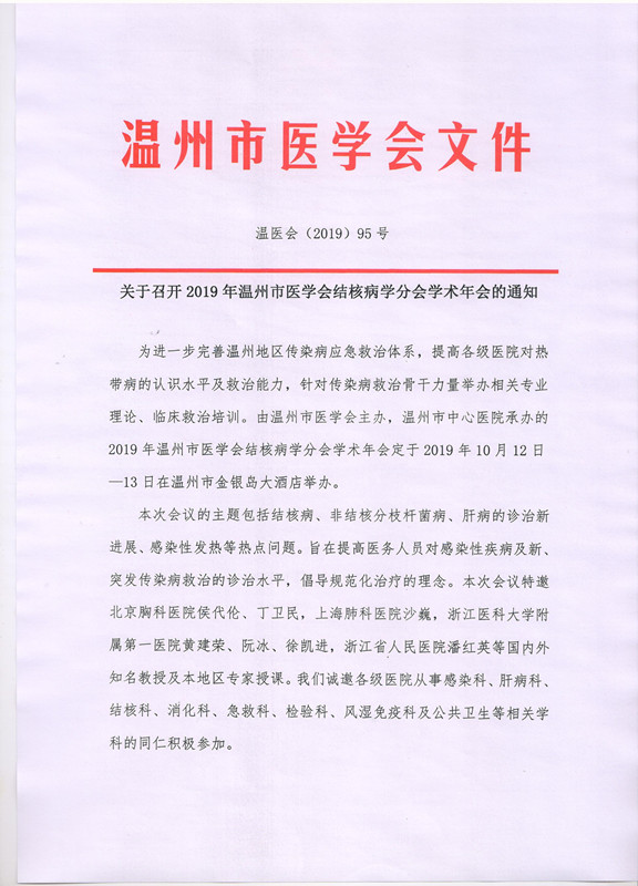 关于召开2019年温州市医学会结核病学分会学术年会的通知