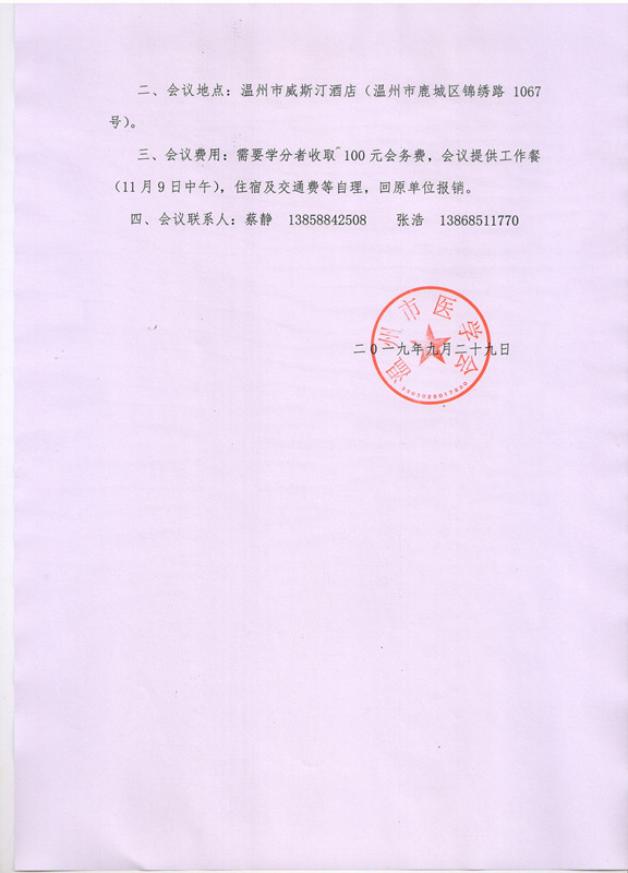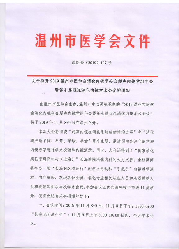 关于召开2019温州市医学会消化内镜学分会超声内镜学组年会暨第七届瓯江消化内镜学术会议的通知