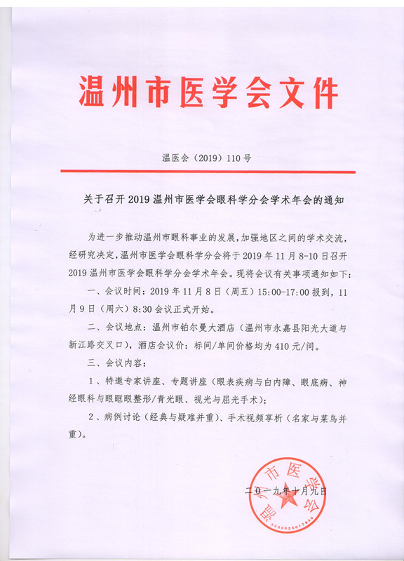 关于召开2019温州市医学会眼科学分会学术年会的通知