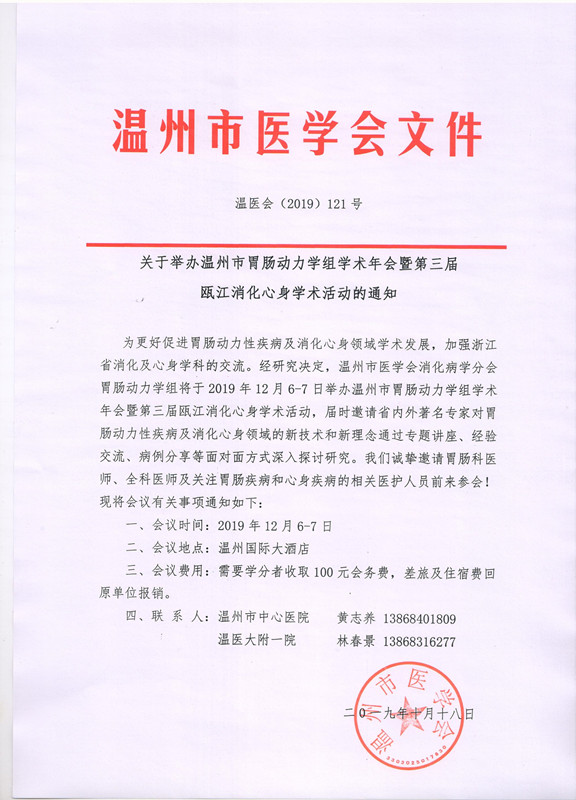 关于举办温州市胃肠动力学组学术年会暨第三届瓯江消化心身学术活动的通知