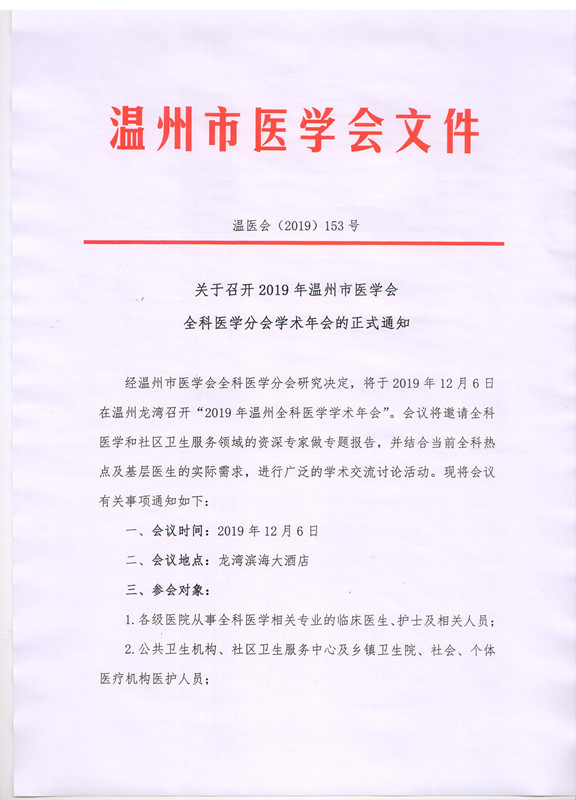关于召开2019年温州市医学会全科医学分会学术年会的正式通知