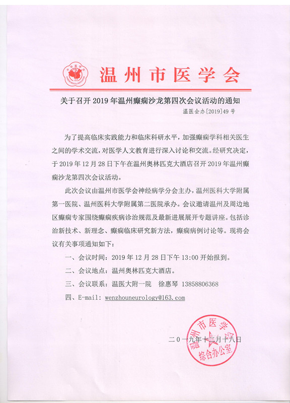 关于召开2019年温州癫痫沙龙第四次会议活动的通知