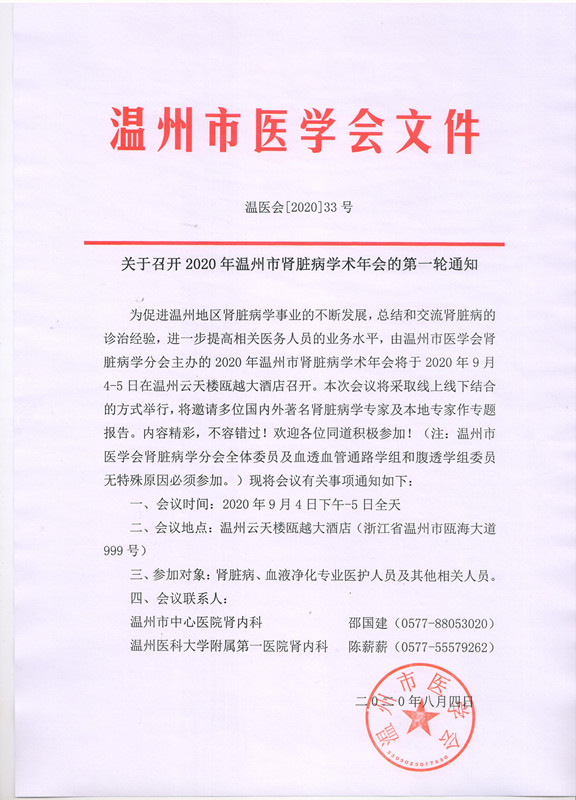 关于召开2020年温州市肾脏病学术年会的第一轮通知