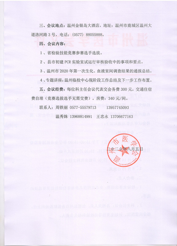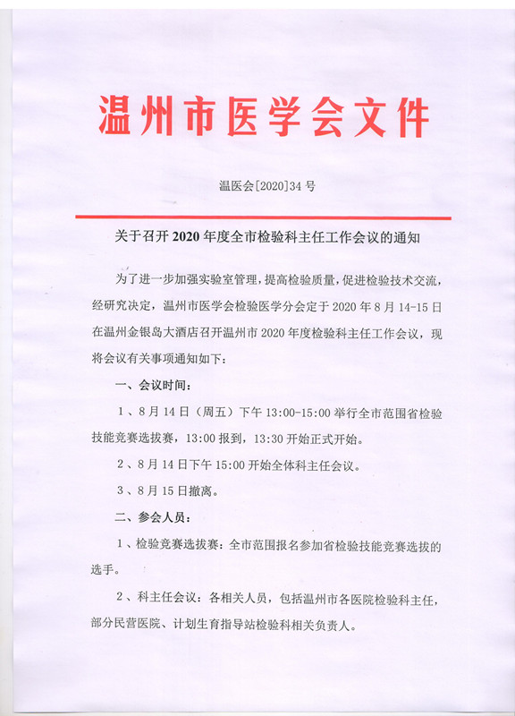 关于召开2020年度全市检验科主任工作会议的通知