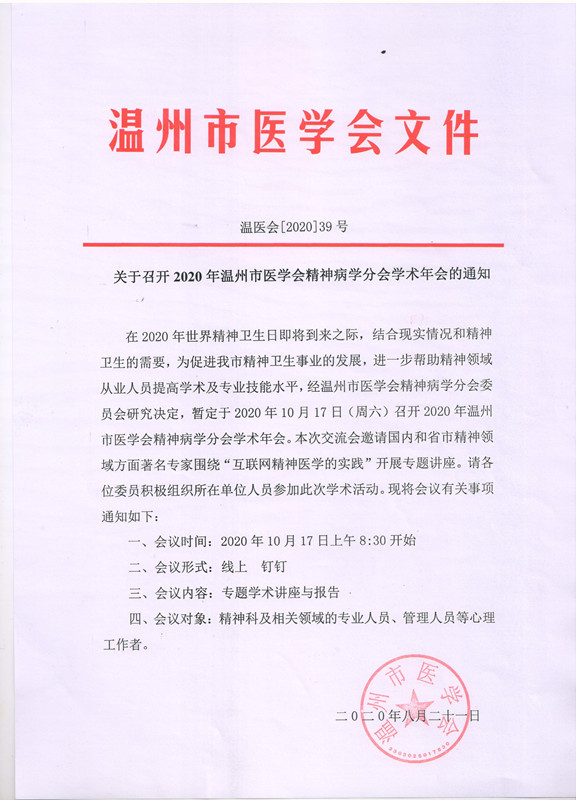 关于召开2020年温州市医学会精神病学分会学术年会的通知