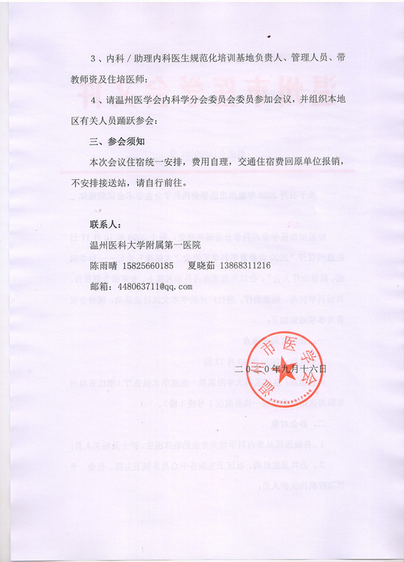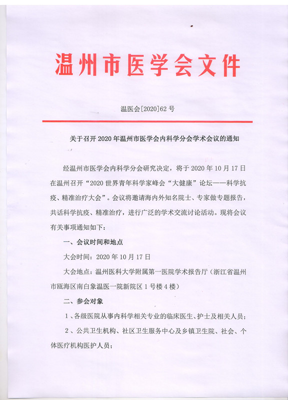 关于召开2020年温州市医学会内科学分会学术会议的通知