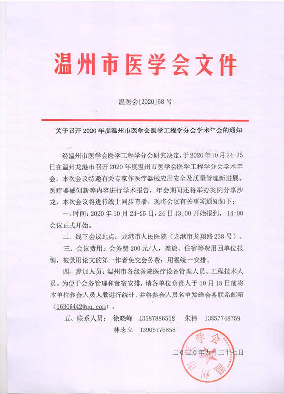 关于召开2020年度温州市医学会医学工程学分会学术年会的通知