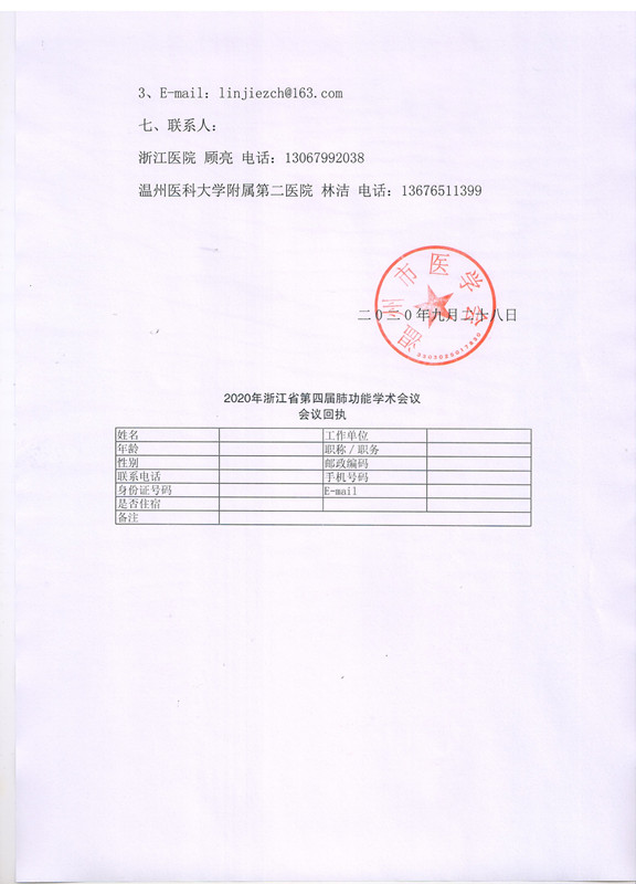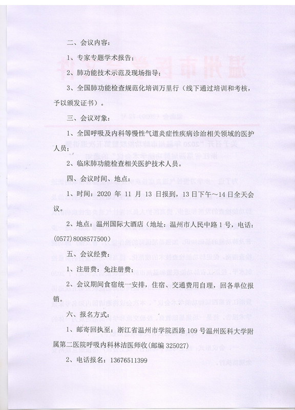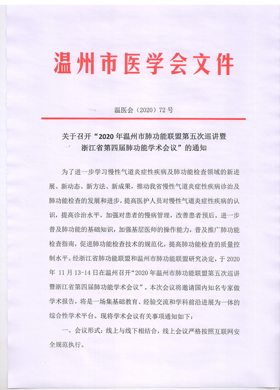 关于召开“2020年温州市肺功能联盟第五次巡讲暨浙江省第四届肺功能学术会议”的通知