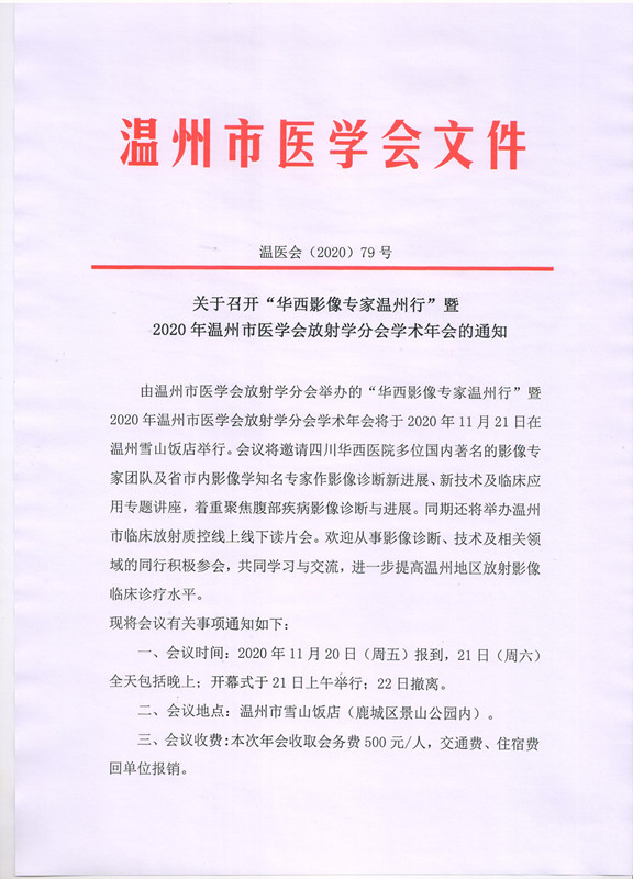 关于召开“华西影像专家温州行”暨2020年温州市医学会放射学分会学术年会的通知