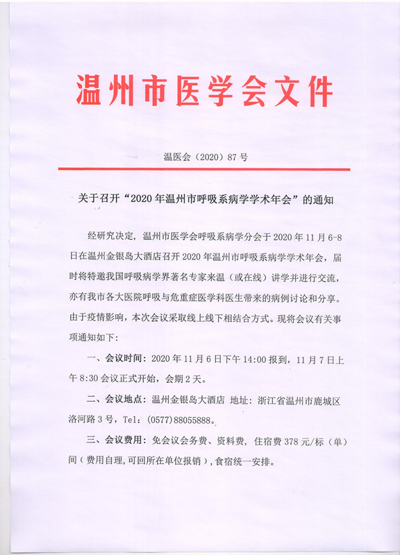 关于召开“2020年温州市呼吸系病学学术年会”的通知