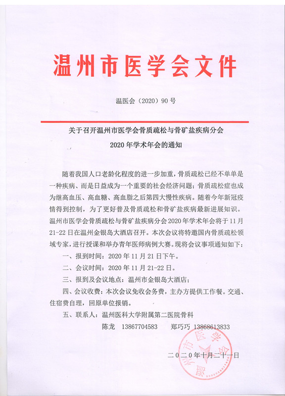 关于召开温州市医学会骨质疏松与骨矿盐疾病分会2020年学术年会的通知