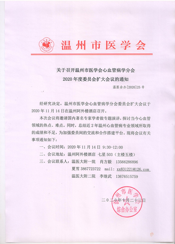 关于召开温州市医学会心血管病学分会2020年度委员会扩大会议的通知