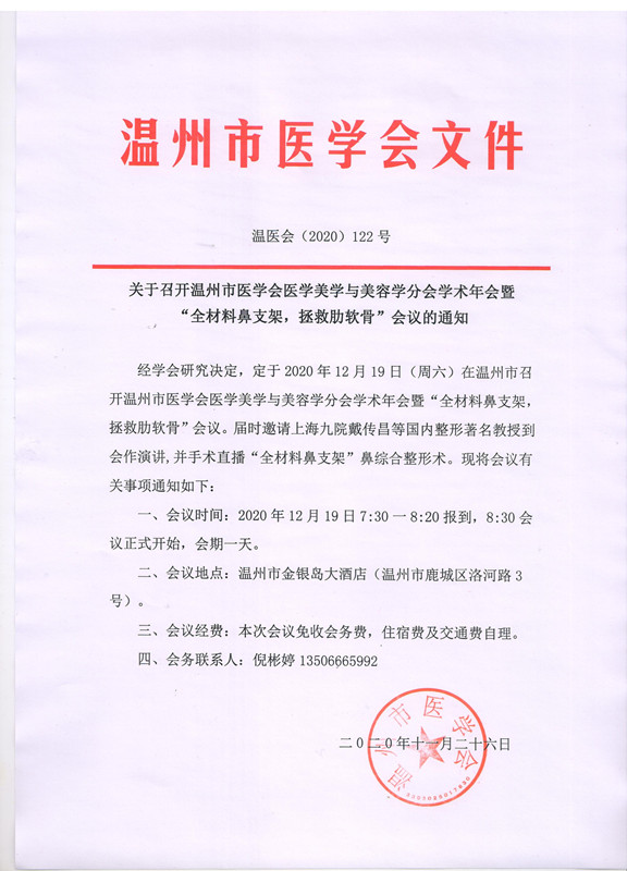 关于召开温州市医学会医学美学与美容学分会学术年会暨“全材料鼻支架,拯救肋软骨”会议的通知