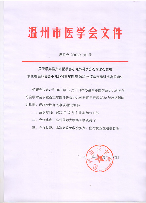 关于举办温州市医学会小儿外科学分会学术会议暨浙江省医师协会小儿外科青年医师2020年度病例演讲比赛的通知