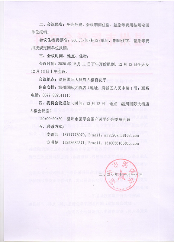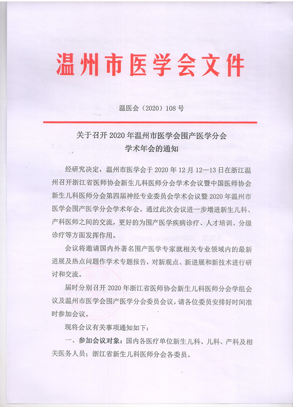 关于召开2020年温州市医学会围产医学分会学术年会的通知