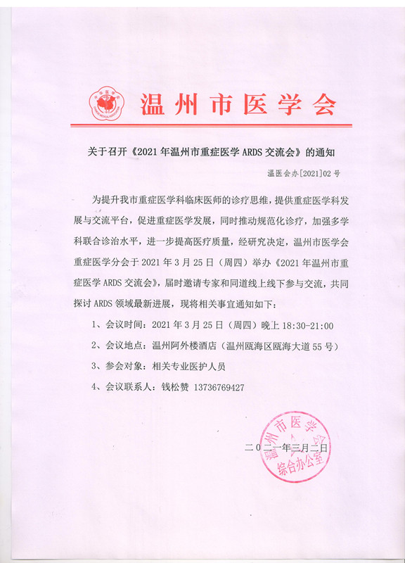 关于召开《2021年温州市重症医学ARDS交流会》的通知