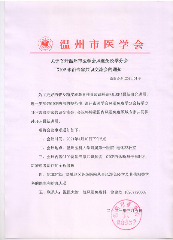 关于召开温州市医学会风湿免疫学分会GIOP诊治专家共识交流会的通知