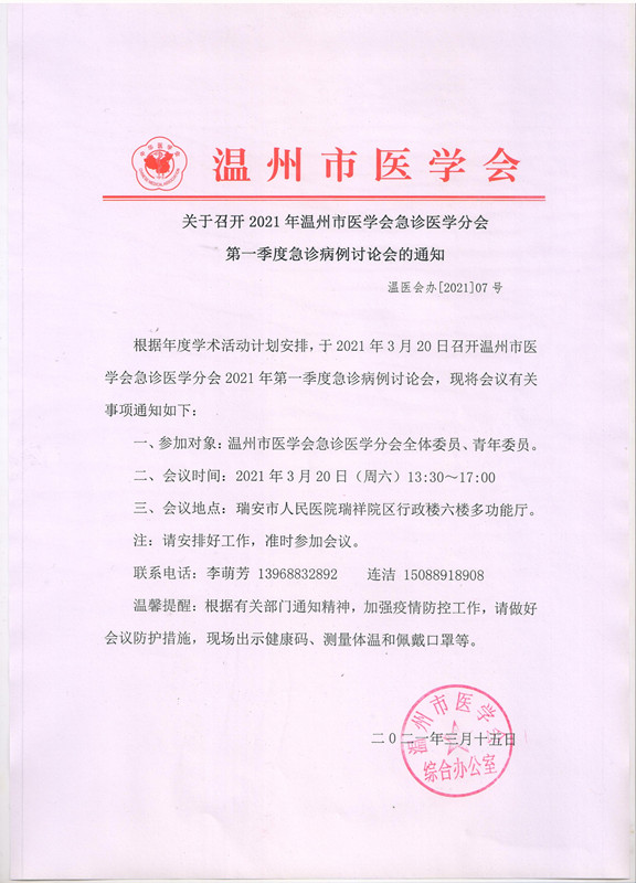 关于召开2021年温州市医学会急诊医学分会第一季度急诊病例讨论会的通知