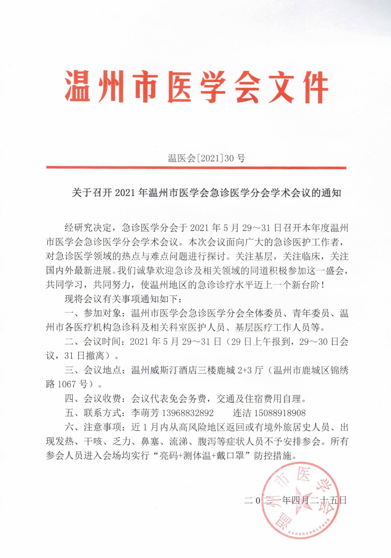 关于召开2021年温州市医学会急诊医学分会学术会议的通知