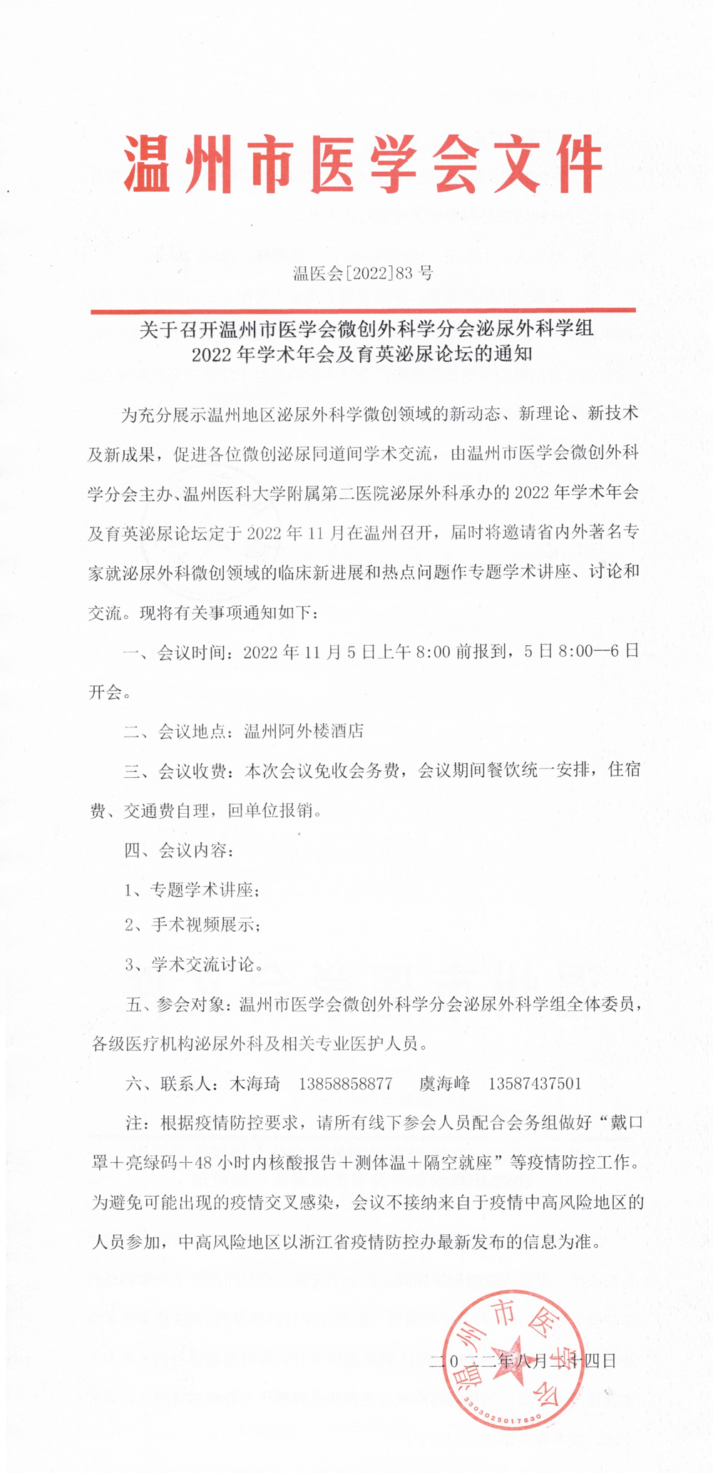 关于召开温州市医学会微创外科学分会泌尿外科学组2022年学术年会及育英泌尿论坛的通知