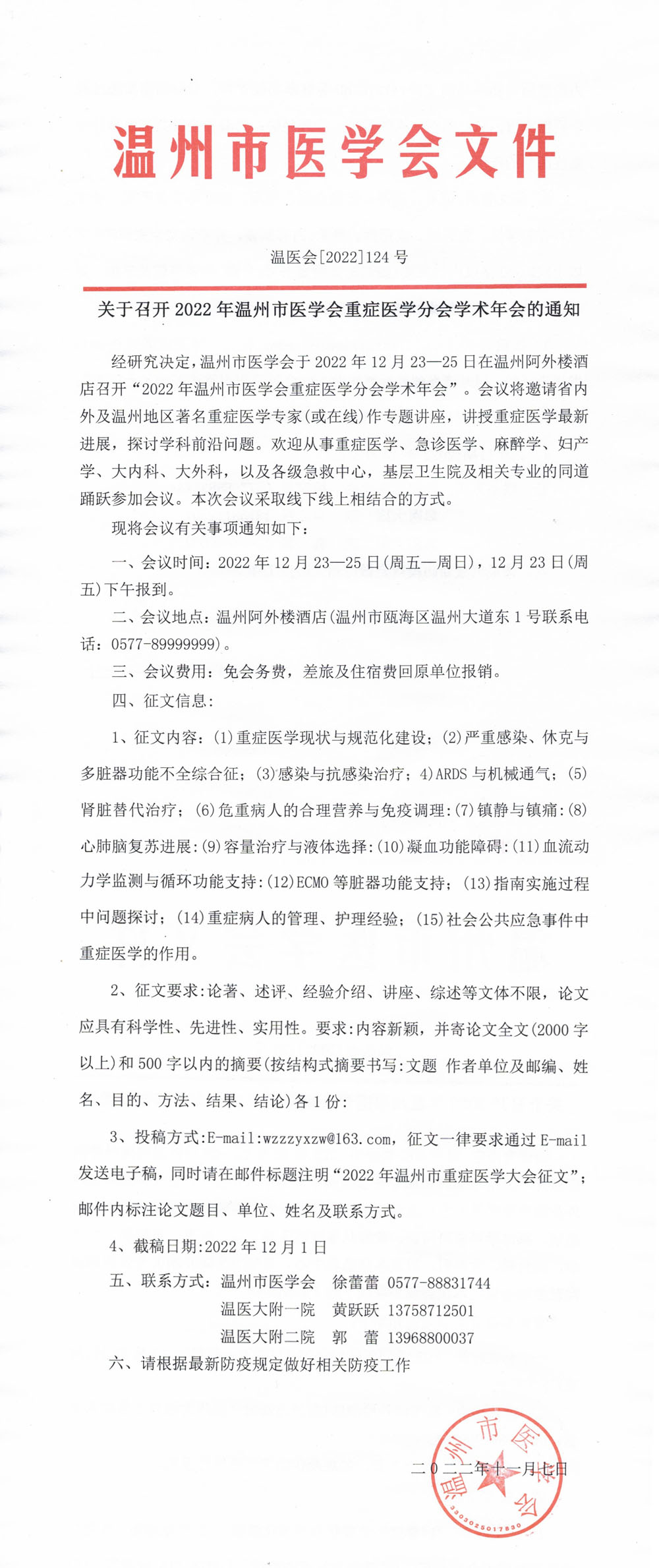 关于召开2022年温州市医学会重症医学分会学术年会的通知