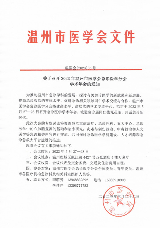 关于召开2023年温州市医学会急诊医学分会学术年会的通知