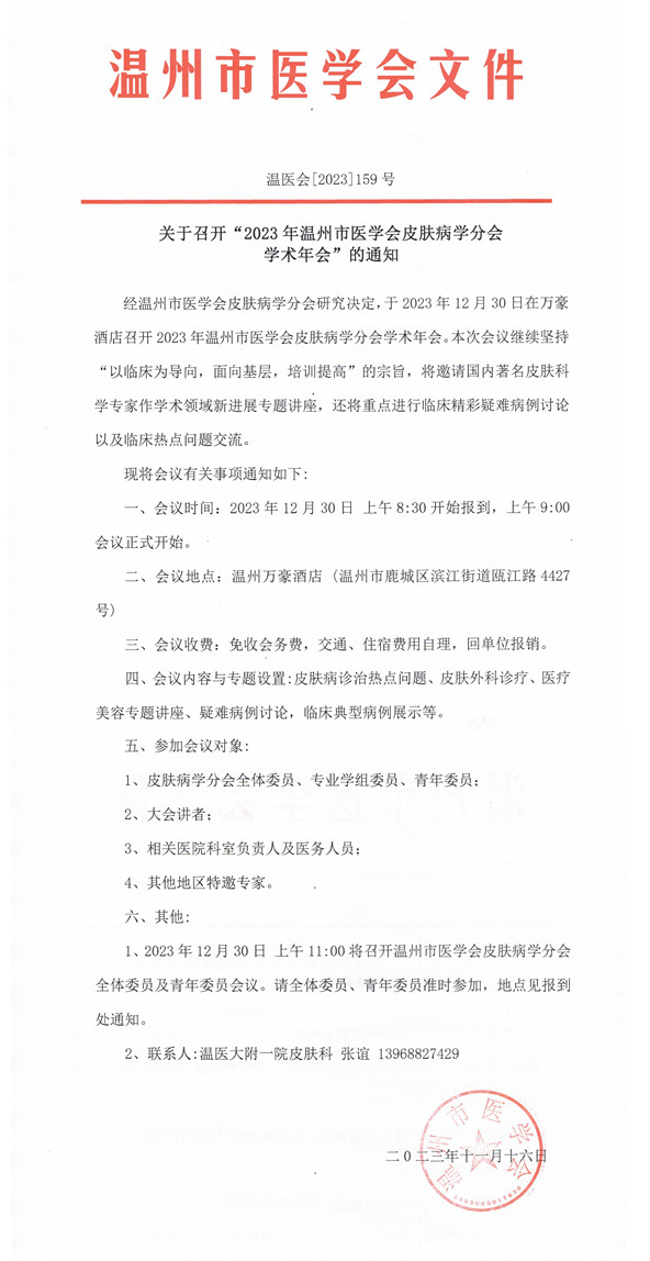 关于召开“2023年温州市医学会皮肤病学分会学术年会”的通知