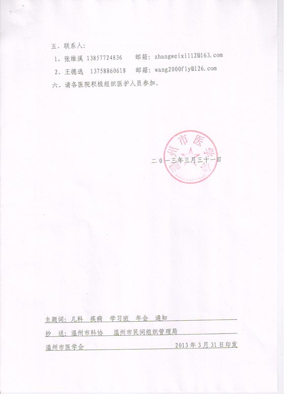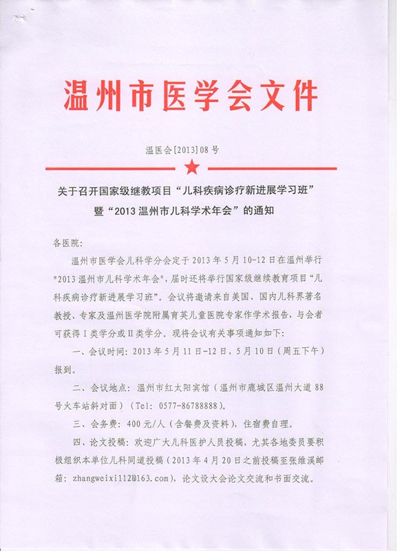 关于召开国家级继教项目“儿科疾病诊疗新进展学习班”暨“2013温州市儿科学术年会”的通知