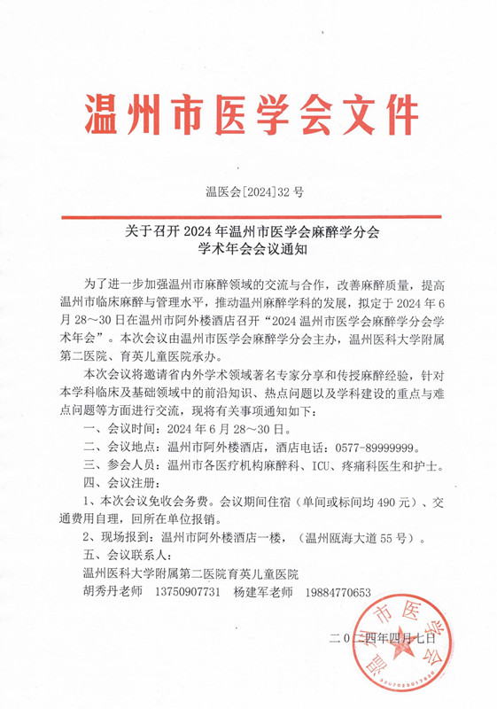 关于召开2024年温州市医学会麻醉学分会学术年会会议通知