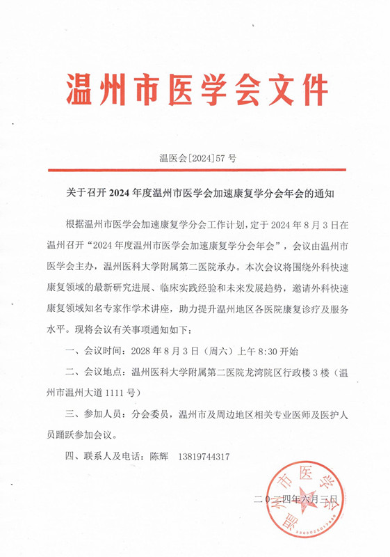 关于召开2024年度温州市医学会加速康复学分会年会的通知