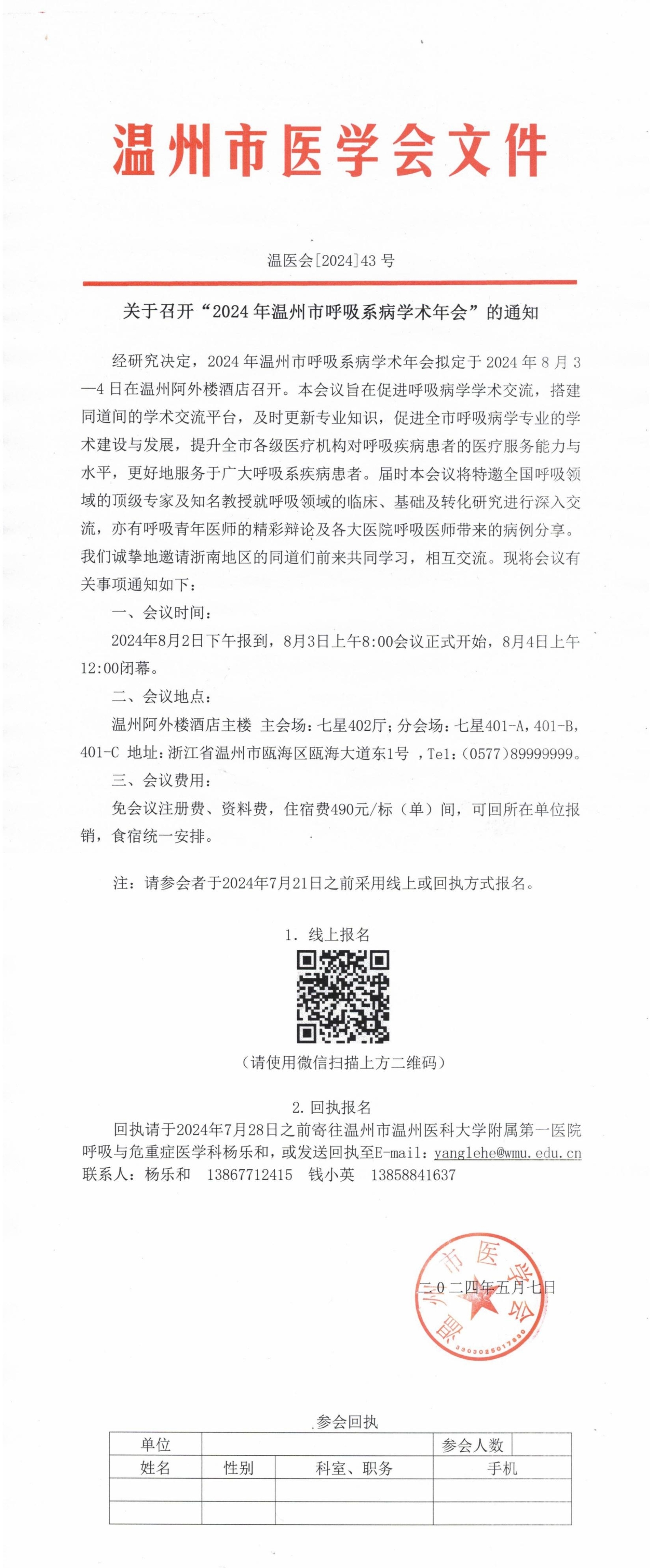 关于召开”2024年温州市呼吸系病学术年会“的通知