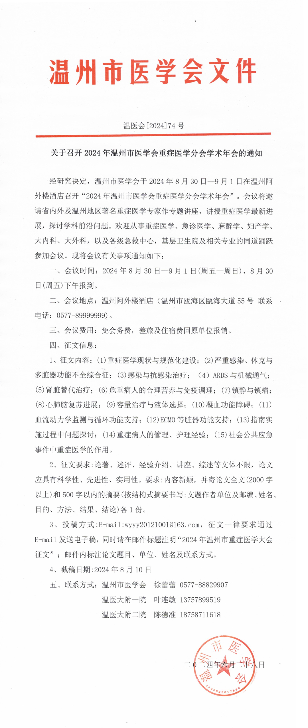 关于召开2024年温州市医学会重症医学分会学术年会的通知