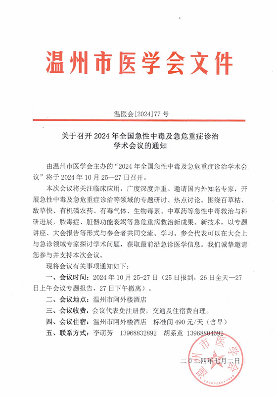 2024年全国急性中毒及急危重症诊治学术会议的通知