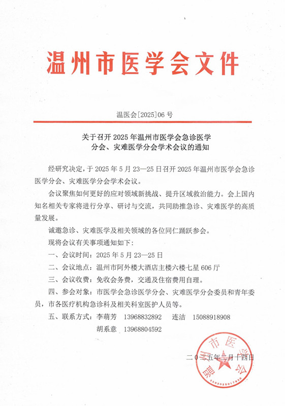 关于召开2025年温州市医学会急诊医学分会、灾难医学分会学术会议的通知