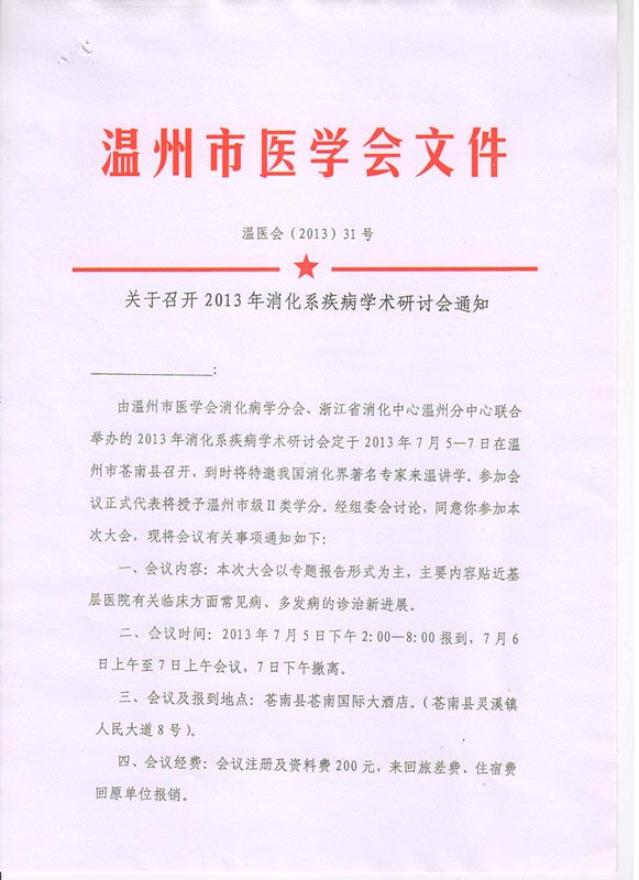 关于召开2013年消化系疾病学术研讨会通知